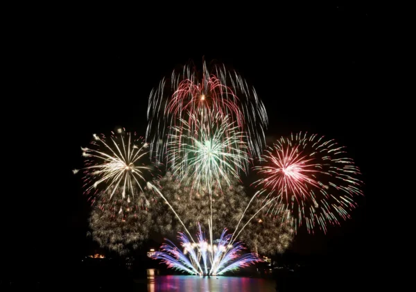 Fireworks over the lake — just you, the stars, and the reflections below.